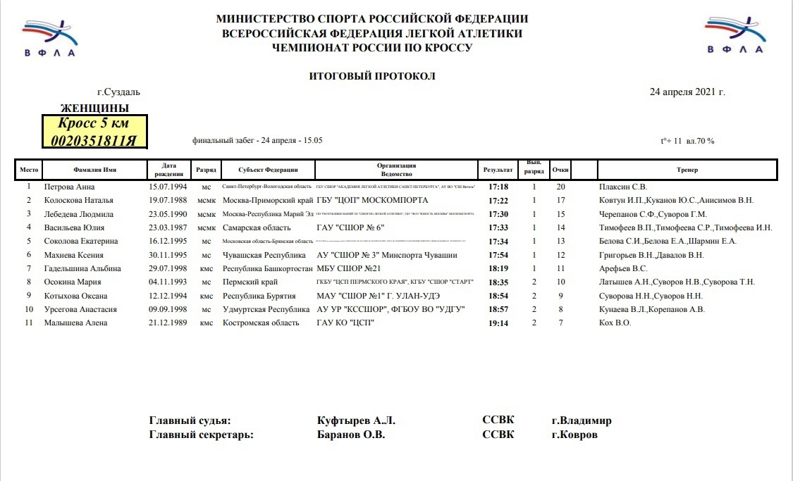Финальный забег Чемпионата России по кроссу, который проходил в городе Суздаль Владимирской области, состоялся 24 апреля 2021 года.